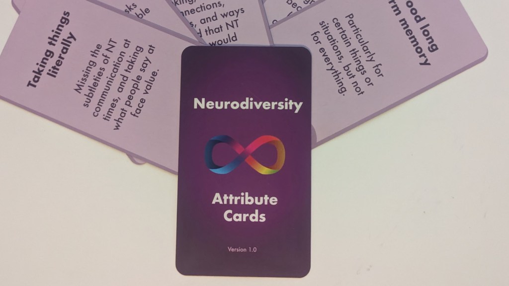 A set of training cards and supporting materials for training neurotypicals, describing a wide range of common neurodivergent traits – these are available for a limited period only. Includes details of how I would use them in a training session.